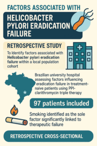 • This is a retrospective study in a Brazilian university hospital assessing factors influencing eradication failure in treatment-naive patients using PPI-clarithromycin triple therapy.